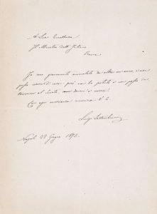 In 8vo, mm. 225 x 165, una pag. su bifolio. Lettera autografa firmata dat. Napoli 22 Giugno 1875. Nitido corsivo, inchiostro nero.