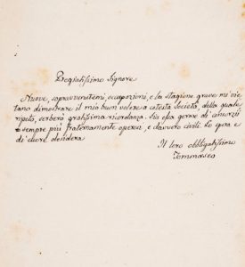 Lettera di cortesia. Il letterato dalmata, che si firma “Il loro obbligatissimo Tommaseo”, scrive a S. Ronchetti, Cassiere della Società degli Studenti.