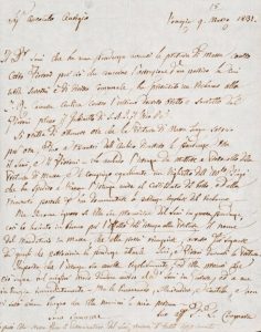 4 pp. in 8vo, di mm. 260 x 210. Nitida grafia in corsivo, inchiostro bruno. Una pagina di testo con firma in basso a sinistra. Lettera viaggiata, con data Venezia 9 marco 1831.
