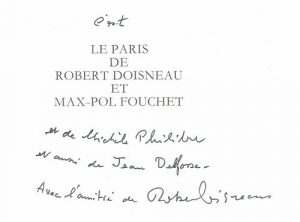 Doisneau, Robert (1912-1994) Le Paris de Robert Doisneau et Max-Pol Fouchet. Éditions Messidor, Paris, 1987. In-4 (28 x 21 cm). Édition originale, signée et dédicacée par Robert Doisneau. Cartonnage illustré sous jaquette illustrée.