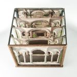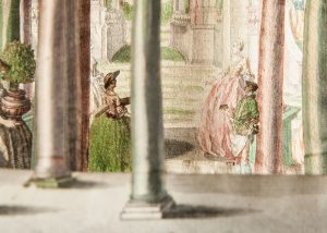 Five beautiful theatrical scenes make up a gallant scene within a garden with a colonnade. The paper theaters or dioramas offered to the viewer an image perspective very striking, made even more spectacular by the coloration and the use of candles as light sources in a fifth set and the other.