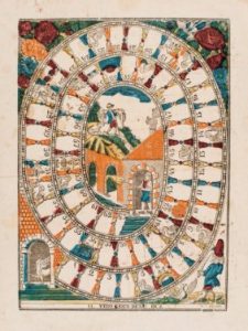 RARISSIMO ESEMPLARE IN COLORITURA d’epoca di questo gioco dell’oca con sessantatre caselle numerate mute.
