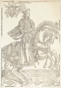 Ristampa ottocentesca tratta dalla matrice originale del fondo Soliani di Modena, con l’inserimento del monogramma “B”. Rigoli e Savarese: “Il personaggio raffigurato a cavallo verso destra su un pavimento a motivi geometrici. … Il legno è databile, secondo David Landau al 1563 circa.