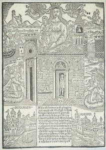 •SOLIANI. La casa di Nazareth a Loreto. XIX secolo.•Silografia, mm. 390x270. Piccolo margine. • RARISSIMO FOGLIO VOLANTE.. Complessa rappresentazione della casa di Nazareth a Loreto. In alto e nella parte centrale, la Madonna con il Bambino, la Santa Casa, angeli, cavalieri e devoti inginocchiati. In basso tre riquadri: in quello centrale la preghiere “Ave dolce Maria di gra plena”, negli altri due le vedute fantastiche di Recanati e Ancona. Si tratta di una ristampa ottocentesca tratta dalla matrice originale del fondo Soliani di Modena. I Soliani sono una famiglia di tipografi modenesi. Nel 1646, Bartolomeo fondò l'omonima tipografia, attiva fino al 1870. Le stampe dei Soliani che costituiscono nel loro insieme uno dei documenti più notevoli dell'incisione popolare italiana. No nelle bibliografie consultate. •Cfr. Landau, I legni incisi, 1986.