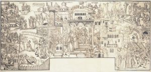 Silografia in tre fogli, mm. 390x812. Piccolo margine. In alto a sinistra, in cartiglio, il nome “IHERVUSALEM. Nel foglio centrale, in basso, il monogramma YAE.