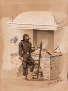 Bell’acquarello che ritrae uno spazzacamino, raffigurato all’interno di una stanza sopra una scala innanzi al camino, ancora sporco di fuliggine. L’acquarello riporta la firma di Ferdinando, discendente della nobile famiglia triestina De Leitenburg, elevata a nobiltà nel 1792 dall’imperatore Francesco II. Curioso il fatto che sia proprio il nobile Ferdinando a ritrarre un soggetto insolito e di gusto tipicamente popolare, in maniera peraltro quasi divertita e affettuosa.