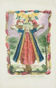 RARISSIMO FOGLIO VOLANTE., per l’esportazione in Spagna e nell’America spagnola. L’iscrizione indica “Santa Librada Virgen y Martyr” Nel catalogo REMONDINI si trova nelle Francesine, assortimento di stampe sacre e devozionali con immagini che si veneravano in America, Spagna, Portogallo, Germania, Polonia, Italia eccetera.