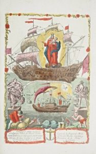RARISSIMO FOGLIO VOLANTE., per l’esportazione nell’America spagnola. Francesina con illustrazione molto animata: due navi e molti personaggi, fra i quali troneggia un indiano con copricapo di piume. Nell’iscrizione in spagnolo la Madonna del Rosario è indicata come “Capitana y Protecora de las Flotas de Espana”. L’esemplare del Museo di Bassano riprodotto da Zotti è privo delle iscrizioni.