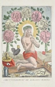 RARISSIMO FOGLIO VOLANTE.. Sopra il Cristo sono raffigurati sette episodi della sua vita, dalla nascita alla crocefissione. Il titolo è un passo errato del Salmo 17, “Circundederunt me dolores mortis”.
