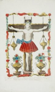 REMONDINI. Cristo crocifisso di Oaxaca. Bassano, REMONDINI, XVIII secolo. Acquaforte, coloritura coeva a pennello con tocchi d’oro.