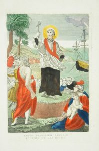 RARISSIMO FOGLIO VOLANTE....., per l’esportazione in Spagna e nelle colonie spagnole. Il santo, definito “apostol de las Indias”, è attorniato da diversi personaggi, fra cui uno col turbante. Sullo sfondo la nave che lo ha portato nelle Indie.