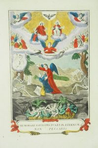 RARISSIMO FOGLIO VOLANTE., non rinvenuto nelle bibliografie consultate. Complessa tavola sinottica che illustra la sentenza dell’Ecclesiaste “Memorare novissima tua et in Aeternum non peccabis”.