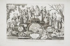 RARA TAVOLA, per l’esportazione in Spagna e colonie spagnole. Rigoli: “Le figure dell’uomo e della donna sono disposte in coppia sui gradini della scala, dieci anni d’età per ciascun gradino, dalla culla sino ai 100 anni… La Raccolta conserva due esemplari di questa incisione, uno colorato e l’altro non colorato, sempre in lingua spagnola, destinati all’esportazione.”