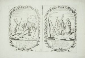 RARISSIMA TAVOLA, foglio per ventola. Rigoli: “è suddiviso come di consueto in due immagini racchiuse entro una incorniciatura di rami. A sinistra un asino guida con il bastone il suo padrone che porta due pesanti botti secondo una tipica rappresentazione del mondo alla rovescia. A destra un gentiluomo ascolta il pronostico di una zingara e alle sue spalle vi è la morte con la falce e la clessidra.”