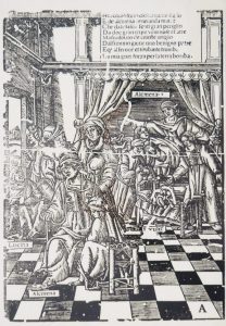 Il monogramma “A”, posto in basso a destra,potrebbe indicare l’intagliatore fiorentino Luc’Antonio degli Uberti, la cui produzione nella prima metà del Cinquecento è disseminata in più di sessanta edizioni pubblicate a Venezia. Lo stile e le espressioni dei volti ricordano l’artista fiorentino: in particolare, il volto di Alcmena appare assai simile a quello della Madonna nella Crocifissione con i santi Francesco e Girolamo, ristampata dai Soliani nei primi anni del XIX secolo.