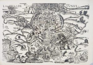 Silografia. Foglio mm. 302x430. Margini. In alto titolo: La presa de Tvnes. Toponimi e data 1535 nell’immagine. Monogramma con le iniziali A.Z.F. entro cerchio sormontato da croce di S. Andrea, in basso a destra.