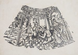 RARISSIMO FOGLIO VOLANTE.. La stampa, proveniente dal Fondo Soliani, raffigura una vivace scena di vita popolare, con i personaggi che bevono in una rustica locanda: piegato in forma di cono, il foglio serviva per avvolgere il gomitolo di lana.