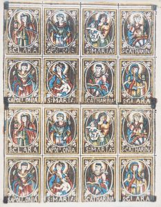 Rarissimo foglio con 16 immagini di santini da ritagliare, nelle tonalità di rosso, verde, giallo e blu. Sono raffigurate La Madonna con Bambino, S. Apollonia, S. Catharina e S. Clara.