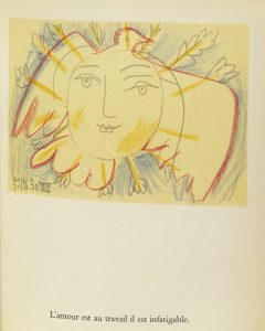 Ces lithographies, datées et numérotées dans la pierre, sont des déclinaisons d'une superposition de la colombe de la Paix et d’un visage. Cet ouvrage marque la dernière collaboration de Paul Éluard avec Pablo Picasso.