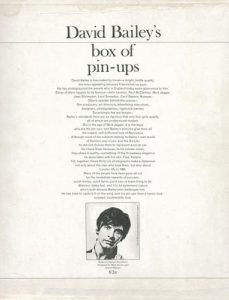 Bailey, David (né en 1938) David Bailey’s box of pin-ups. Weidenfeld & Nicolson, Londres, 1965. In-folio (38 x 33 cm). Portfolio complet contenant les 36 portraits reproduits en noir et blanc avec légendes imprimées aux versos. Planches en très...
