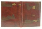 in-8, reliure faite d’un assemblage à niveau de pièces de veau sang de bœuf, mordoré et brun terre, séparées les unes des autres par un petit sillon fin noir, dos long avec titre à froid, doublures de veau sang de bœuf, gardes de peau suédée gris éléphant, couverture et dos conservés, non rogné, chemise et étui, [m[onique] m[athieu], 1977].