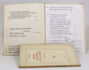Précieux exemplaire abondamment annoté et augmenté par André Frénaud, en différentes campagnes (crayon, stylo bille noir, rouge, bleu). Quatre feuillets autographes sur papier à carreaux insérés dans l’ouvrage. Mention autographe « exemplaire de travail » sur le f. de faux-titre.
