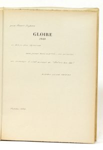 Envoi autographe signé de Pierre-Jean Jouve à l’éditeur et poète Pierre Seghers, daté d’octobre 1944 : « [Gloire 1940] livre des épreuves, aux jours tant espérés, en mémoire du courage à ciel ouvert de “Poésie 40-44”. »
