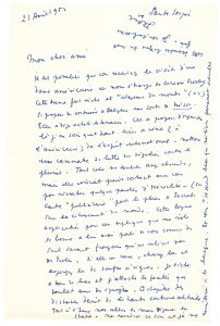 Cocteau fait part des étranges projets de Caresse Crosby ; (…) Cette dame fort riche et « citoyenne du monde » (sic) se propose de construire à Delphes une sorte de trésor. Elle a déjà acheté le terrain. Elle se propose d’organiser là, je ne sais quel haut lieu à rêve (à l’américaine) de l’esprit international, mettons une casemate de lutte du singulier contre le pluriel. Tout cela me semble assez absurde, mais elle voudrait prendre contact avec vous pour récolter quelques paroles d’Héraclite (…). Cocteau a pensé à lui comme du seul savant français qui ne relève pas des Ecoles (…). Ce chapitre devient de la haute couture abstraite (…).