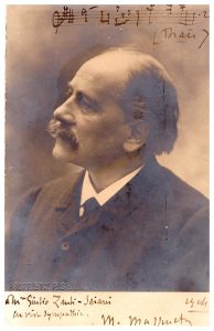 Portrait du compositeur avec envoi autographe à Mme Giulio Zanti-Saiani (…) et avec une portée musicale extrait de son opéra Thaïs.