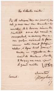 MEYERBEER espère voir NOMMÉ son ami, critique et musicologue Godefroy WEBER. Indisposé ces derniers jours, il n’a pu lui demander des nouvelles de l’Institut ; (…) A-t-on déjà nommé un correspondant ou conservez-vous encore quelque (…) de faire nommer notre savant GodefRoi Weber, si digne de cet honneur ? (…)