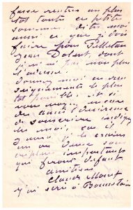 TRÈS BELLE LETTRE de MONET relative à la SOUSCRIPTON pour l’ACHAT du célèbre tableau de l’Olympia de MANET, avant de l’offrir aux Musées nationaux : Je viens d’écrire à Baschet pour qu’il demande l’article sur Manet à Hamel, mais je ne sais pas l’adresse d’Hamel (…). Il le prie encore de lui donner l’adresse de son voisin de table au dîner de l’autre jour, vous savez, notre ami de l’Intransigeant qui a souscrit pour l’Olympia (…). Dites-moi aussi ce que je dois faire pour Pelletan, Jean Dolent (…). Et si vous voyez encore des amis désireux de souscrire, indiquez en moi, car il y aura, je le crains, un ou deux souscripteurs important qui feront défaut (…). Il a écrit à Bonnetain.