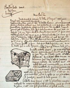 « Nous avons en train moi et Titi 3 boites chacun, et nous sommes plus contents de celles-ci que des précédentes, une fois finies, elles seront bien supérieures, car nous avons suivi ton conseil, nous fesons pas d’histoire, Titi fait des chevaux et moi des lapins, j’ai un lapin dans la chambre qui court et fait des crottes partout, car quoi que je les connaisse, j’ai cru qu’il valait mieux en refaire d’après nature, et ma foi ça va très bien, Titi lui il a des chevaux sur les green tant qu’il veut – il faudra absolument que Conté nous envoie de l’or en feuille, je ferai les yeux des lapins en or, sur la boite qui a cette forme (fig. 1) que je trouve très jolie, la vieille cassette façon ; ça avec des lapins blancs, précieusement émaillés, de l’or par ci par là, de l’herbe grise et des iris en or ! Tu n’as pas idée comme les émaux font bien, c’est si précieux comme matière les rouges sont des rubis les verts émeraude, on dirait des couches de pierres précieuses, j’espère que nous seront prêts pour l’ouverture, mais c’est si long à sécher !!! […] ».