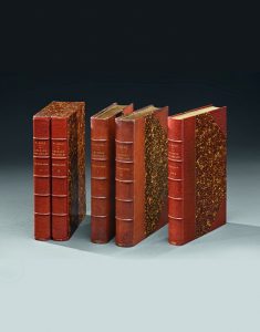 Deux volumes, grand in-8, demi-reliures à coins en maroquin havane. Dos à 5 nerfs portant seulement les titres dorés, non rognés, têtes dorées, couvertures et dos conservées. Étui de luxe, bordure peau réunissant les deux volumes. Quelques piqûres claires éparses comme souvent.