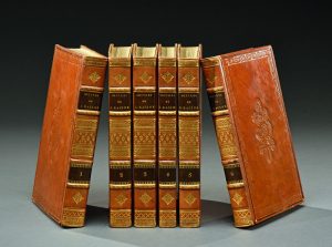 Six volumes, in-8, pleines reliures en veau havane glacé. Dos à 4nerfs très ornés et dorés portant les pièces de titre et de tomaison en maroquin brun, filet noir d’encadrement sur les plats doublé d’une dentelle à froid, large palette à froid au centre des plats, roulette dorée sur les coupes, large roulette dorée sur les chasses, tranches dorées.