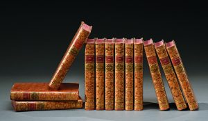 Douze volumes, in-8, pleines reliures de l’époque en veau moucheté. Dos lisses cloisonnés et fleuronnés portant les pièces de titre en maroquin rouge et de tomaison en maroquin vert, filet doré sur les coupes, tranches rouges.