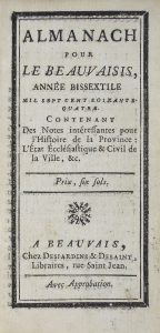 ALMANACH. Almanach pour le Beauvaisis, Année Bissextile 1764, Contenant des Notes intéressantes pour l’Histoire de la Province, l’Etat Ecclesiastique & Civil de la Ville, &c. Suivi de : Recueil d’Instructions et de Recettes, à l’usage des...