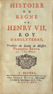 BACON (François). Histoire du Regne de Henry VII, Roy d’Angleterre. Traduit du Latin [par La Tour Hotman]. Bruges, AndréWydts, 1724.
