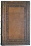 In-folio, reliure peau de truie, dos à 5 nerfs estampés d’un décor à froid, plats orné de frises estampées, tranches rouges.