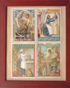 l’une sur fond doré représentant une petite fille évoquant les «bêtises de Sophie »; l’autre représentant des métiers : Cuisinier, Couturière, Maréchal Ferrant, Menuisier.
