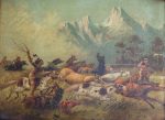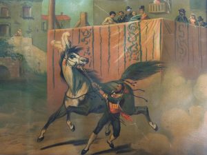 l’une représentant une scène de bataille avec des Indiens (éraflure, brunie, 37 x 50 cm) ; l’autre un cheval de corrida (35 x 45 cm).