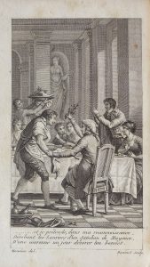 Le frontispice, gravé par Bovinet, d’après Monsiau, est légendé : « et je prétends, dans ma reconnoissance, dérobant les Lauriers d’un Jambon de Mayence, d’une Couronne un jour dérober ton bonnet »,