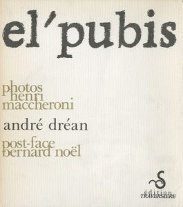 Maccheroni, Henri (né en 1932) El’Pubis. Édition Traversière, Paris, 1978. In-8 (23 x 20,5 cm). Édition originale, brochée. Photographies d’Henri Maccheroni. Texte d’André Dréan. Postface de Bernard Noël. Couverture souple.