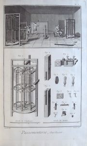 Complet de ses planches : Tisserand : 8 pl. équivalent à 10 à cause de 2 doubles. Passementier : 29 pl. équivalent à 32 à cause de 3 doubles. Marli : 8 pl. équivalent à 15 à cause de 7 doubles. Gazier : 4 pl. Rubanier : 10 pl. équivalent à 20 à cause de 10 doubles. Soierie en cinq sections : 135 pl. équivalent à 158 à cause de 23 doubles.
