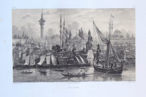 Premier volume (sur 4) relatif au voyage du peintre orientaliste Eugène Flandin (1809-1889) au Proche et Moyen Orient, attaché à l’ambassade en Perse en 1840 et 1841, illustré de 50 superbes lithographies en deux tons représentant des scènes de genre et des vues du Bosphore, de Constantinople, Scutari, détroit des Dardanelles, Smyrne.