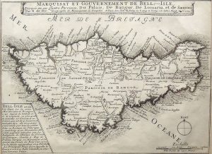 Plan (21 x 28,7 cm au trait) de Belle-Ile, avec le titre en bandeau et une notice historique en bas. Marges courtes, semblant empiéter sur le filet noir à droite.