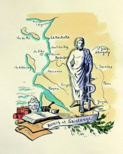 Petit in-4, broché. Couverture illustrée. 160-(7) pp. Dessins dans le texte rehaussés d’aquarelles à la main par l’artiste. Non coupé. On joint : feuillet de souscription et bandeau du Prix de Saintonge 1951.