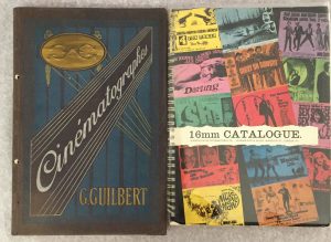 [CINÉMA]. Ensemble de 2 catalogues :{CR}- GUILBERT. Cinématographe. Paris, 1914. – In-4, couverture illustrée avec plaque en métal incrustée sur le premier plat. Broché.{CR}Superbe catalogue illustré à prix marqués, pour l’année...