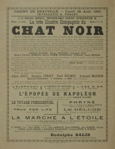 représentation de la compagnie du Chat Noir le lundi 28 août 1893 au casino de Deauville.{CR}Tous les protagonistes de la célèbre compagnie participèrent à cette représentation durant laquelle furent jouées des pièces en ombres chinoises, déclamés des poèmes de Jules Jouy, Jacques Ferny, Paul Delmet, Armand Masson, Maurice Donnay, V. Hyspa, etc. et jouées plusieurs pièces de Caran d’Ache, Fernand Fau, Fragerolle, etc.{CR}Exemplaire parfaitement conservé malgré sa fragilité.