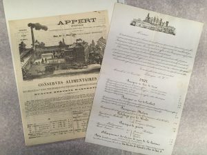 [ALIMENTATION] APPERT. Conserves alimentaires. Paris, [avant 1840]. — 2 ff. in-4. {CR}Belle publicité d’Appert, inventeur et auteur de L’Art de conserver indéfiniment les légumes, les viandes, etc., dont la fabrique se situait à Paris, rue...