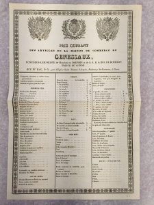 fruits à l’eau-de-vie proposés par Genessaux, confiseur-liquoriste de Monsieur le Dauphin et du duc de Bourbon prince de Condé qui tenait boutique au 34 de la rue du Bac à Paris.{CR}Le document porte en tête les armes du dauphin et du duc de Bourbon et possède un bel encadrement fait de palmettes et de rosaces.{CR}Exemplaire parfaitement conservé.